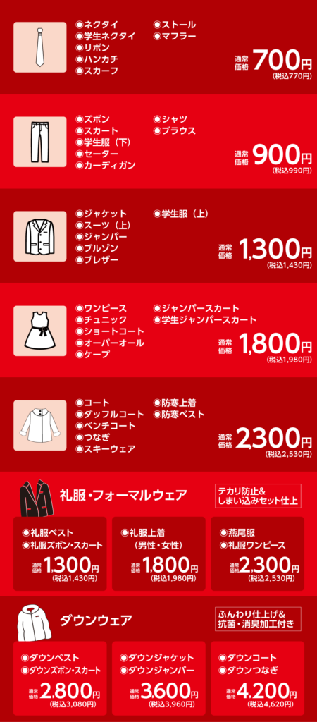 毎週土・日曜日遅割サービス1週間仕上げのゆっくりクリーニングでお出し頂いた点数分をプレゼント!